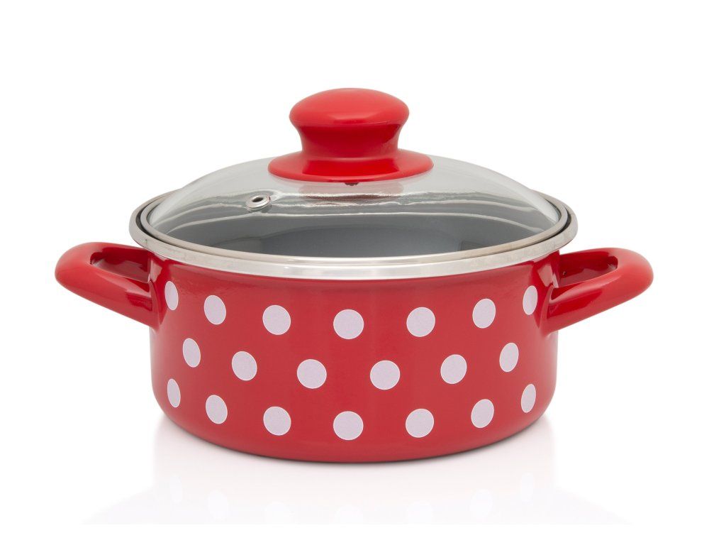 Nabízíme Vám nestárnoucí klasiku na trhu se smaltovaným nádobím - červené smaltované nádobí s bílým puntíkem.