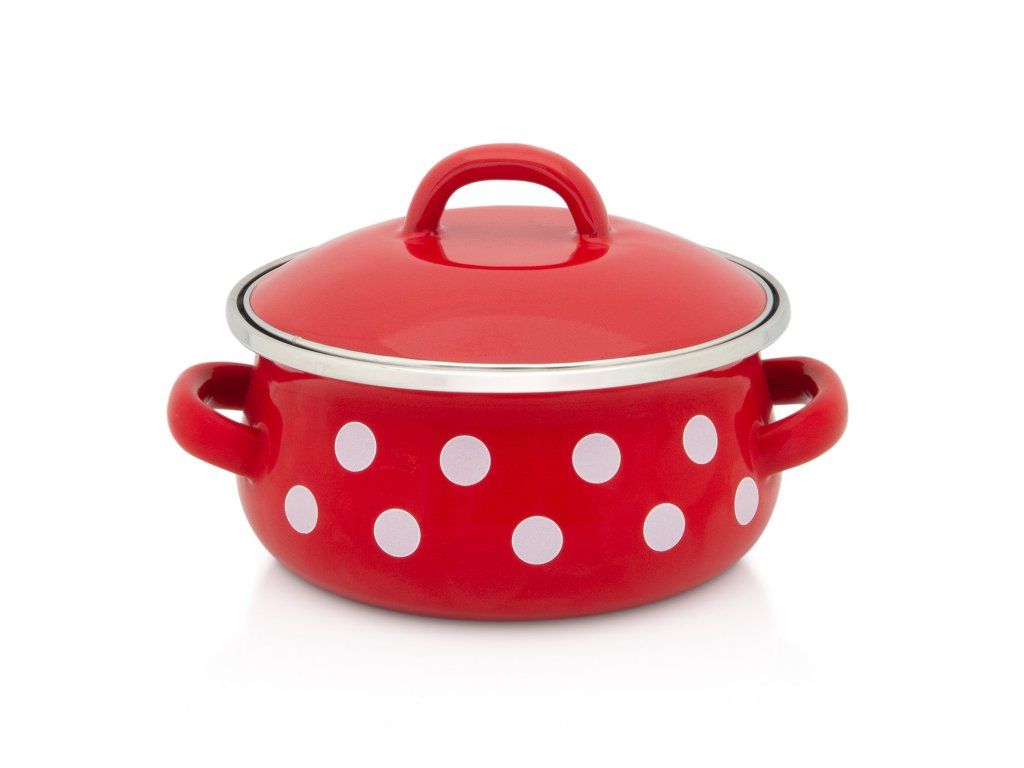 Nabízíme Vám nestárnoucí klasiku na trhu se smaltovaným nádobím - červené smaltované nádobí s bílým puntíkem.