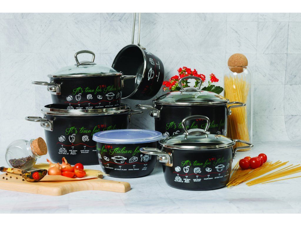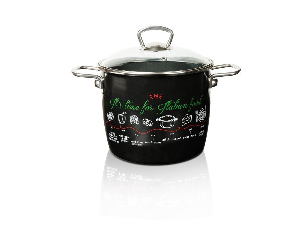 Řada Metalac Italy je velmi moderní řadou smaltovaného nádobí, která kombinuje praktickou skleněnou poklici s praktickými nerezovými úchyty a černým smaltem, který se velmi dobře hodí do současných moderních kuchyní. Na nádobí jsou použity obtisky s barvami z italské trikolory - bílá, zelená a červená. Díky tomu nádobí vypadá velmi svěže.