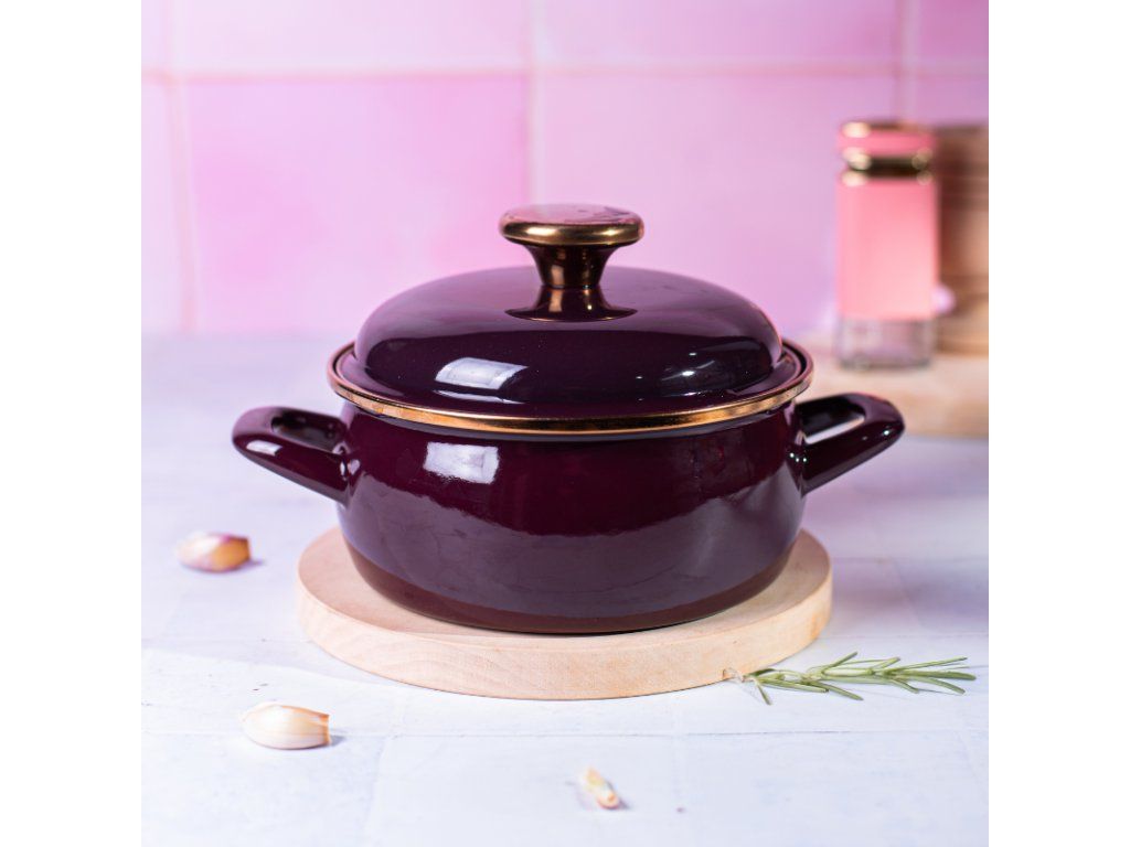 Elegantní smaltované nádobí, ideální pro přípravu jídel pro rodinu či hosty. Intenzivní bordó barva v kombinaci se zlatým zakončením okrajů a rukojeti mu dodává luxusní vzhled, který bude ozdobou každé kuchyně.